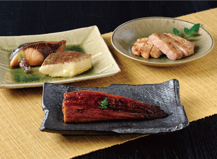 ●セット内容/黒豚モモ味噌漬80g×3、ぶり幽庵漬70g×2、鰻蒲焼・真鯛西京漬各60g×3●賞味期限/冷凍30日