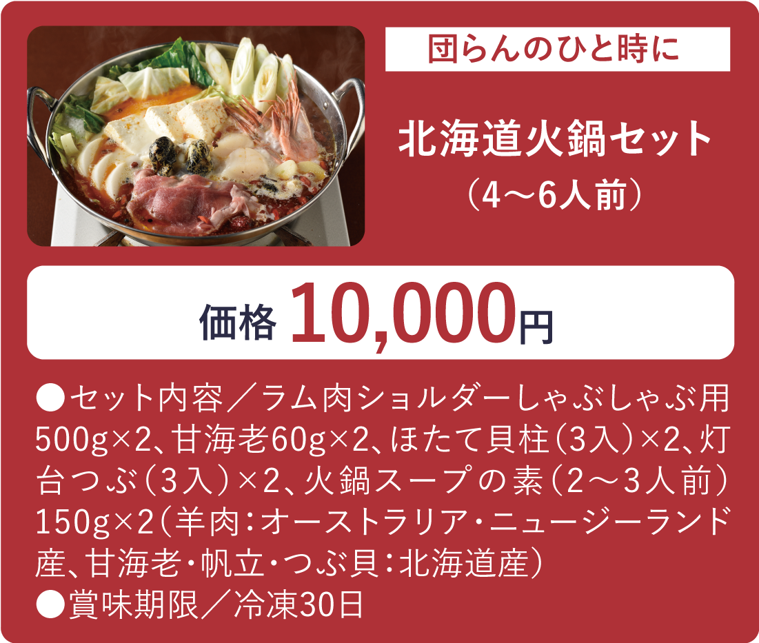 ●セット内容/ラム肉ショルダーしゃぶしゃぶ用500g×2、甘海老60g×2、ほたて貝柱(3入)×2、灯台つぶ(3入)×2、火鍋スープの素(2~3人前)150g×2(羊肉:オーストラリア・ニュージーランド産、甘海老・帆立・つぶ貝:北海道産)●賞味期限/冷凍30日